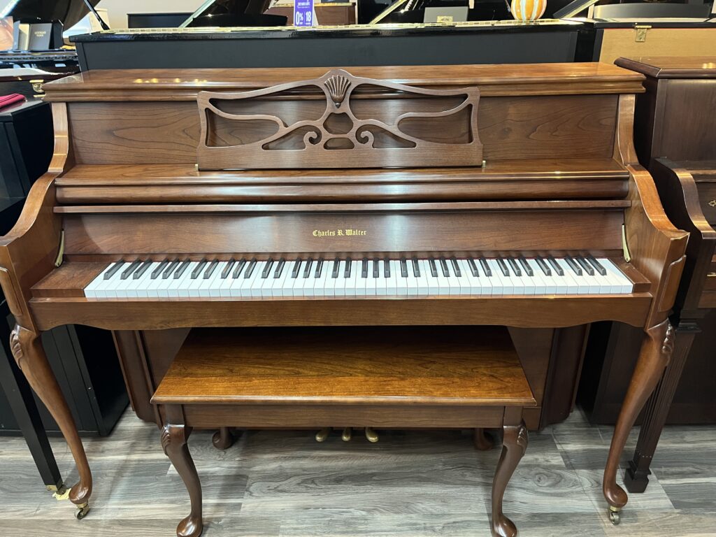 Charles R Walter, a family business, makes some of the highest quality upright pianos ever made with many premium features. The action is full size for an even feel across the keyboard. The middle pedal is a bass-sustain pedal rather than the typical mute pedal. The lid can be propped open for a full sound akin to a grand piano. The hammers are in excellent shape and the key action is smooth and responsive. An excellent piano for a pianist who can appreciate quality craftsmanship.