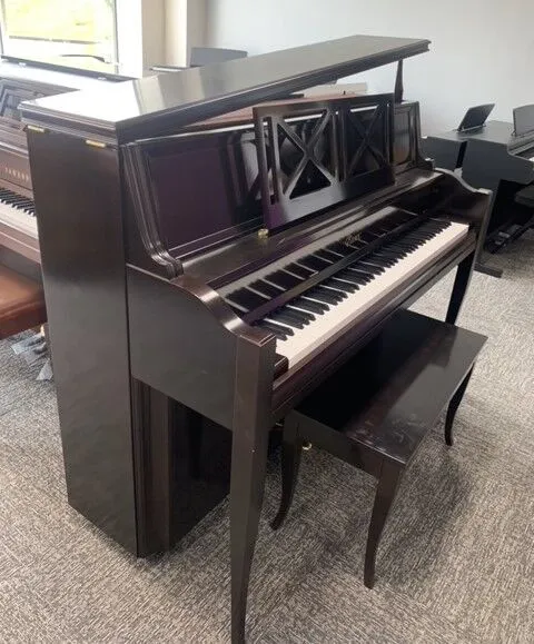 A pretty cherry upright with style! This piano has a good touch and characteristic tone that will fill any space with happy music. Check out the chic legs on the matching bench!