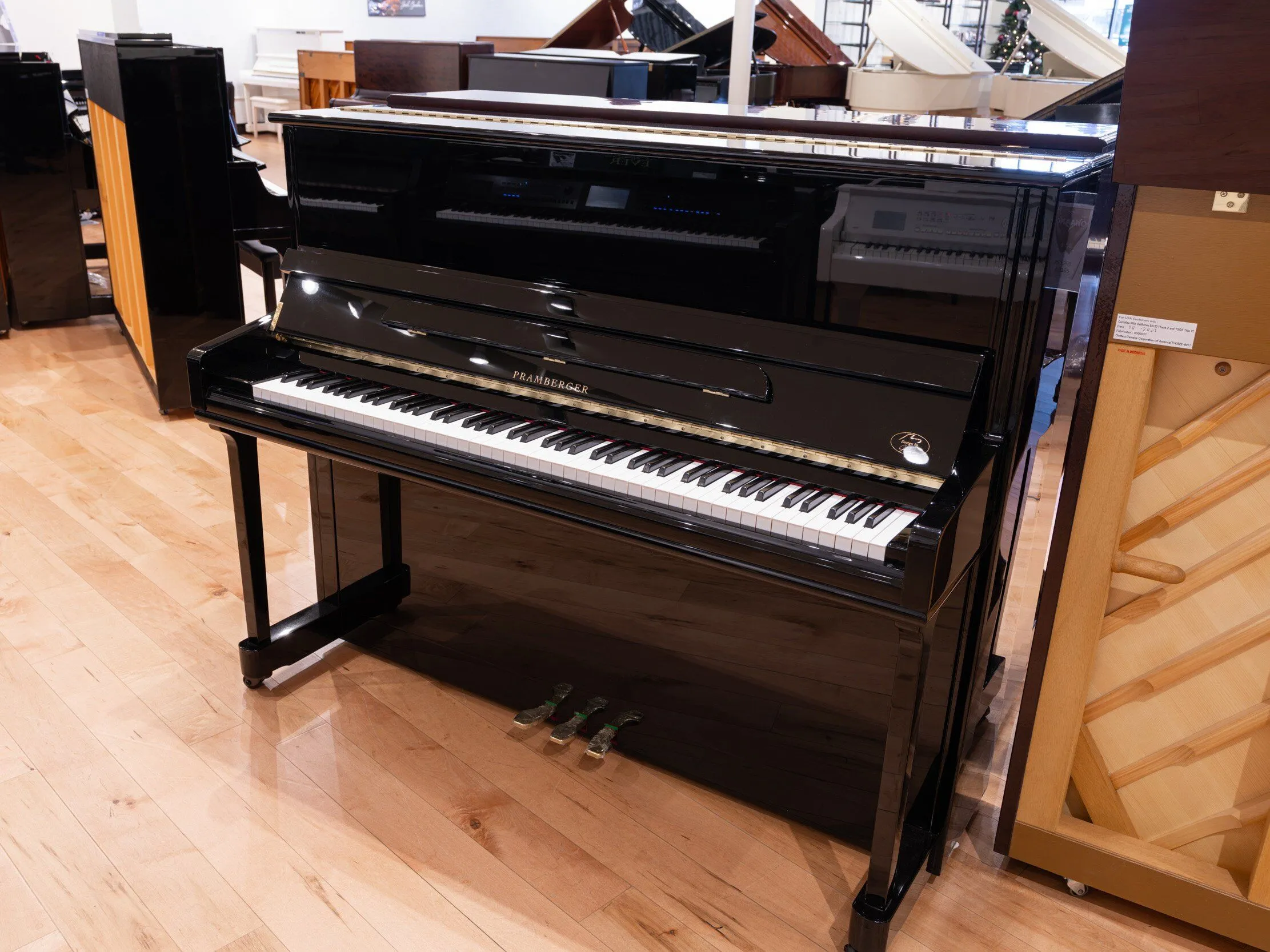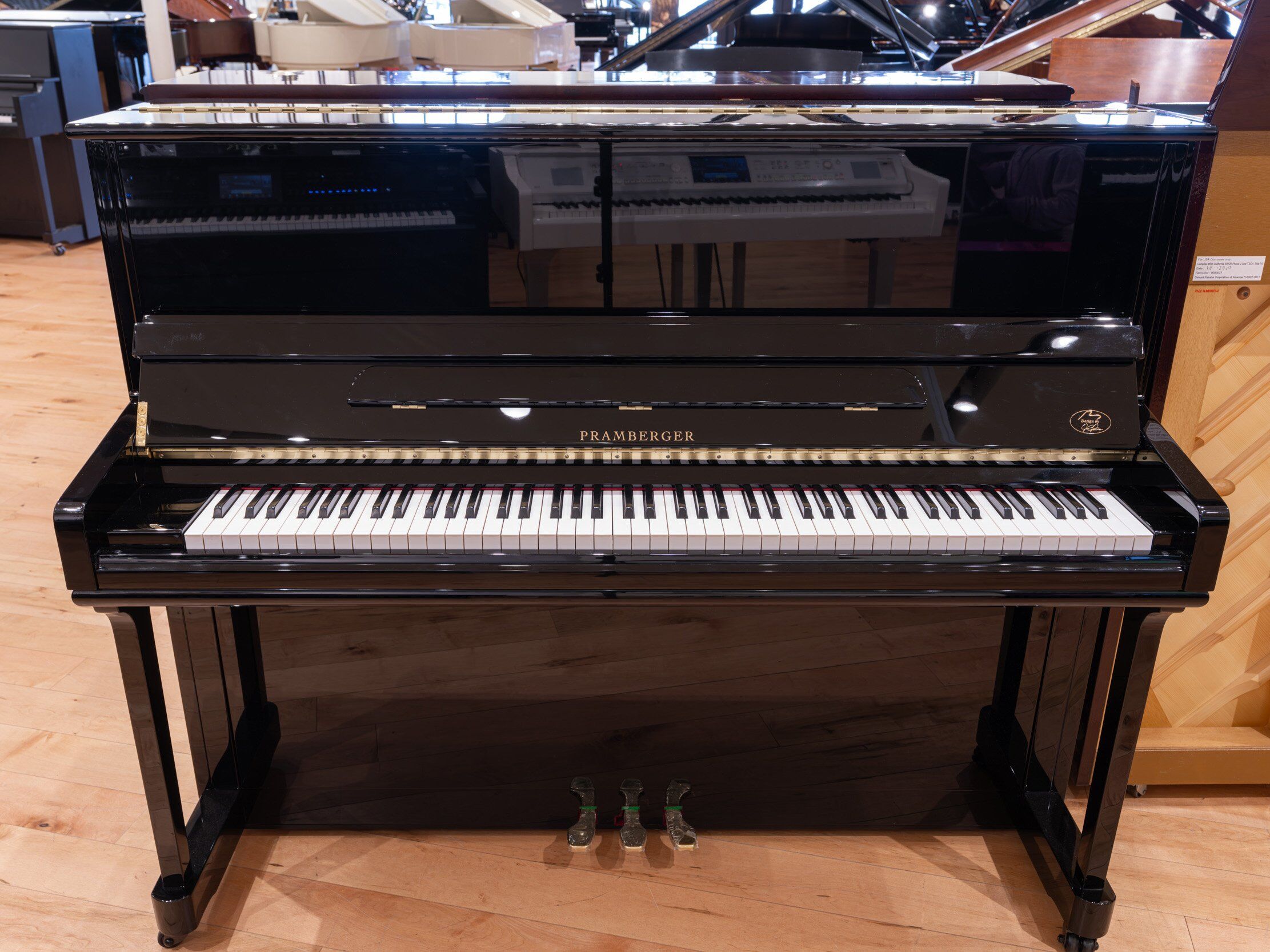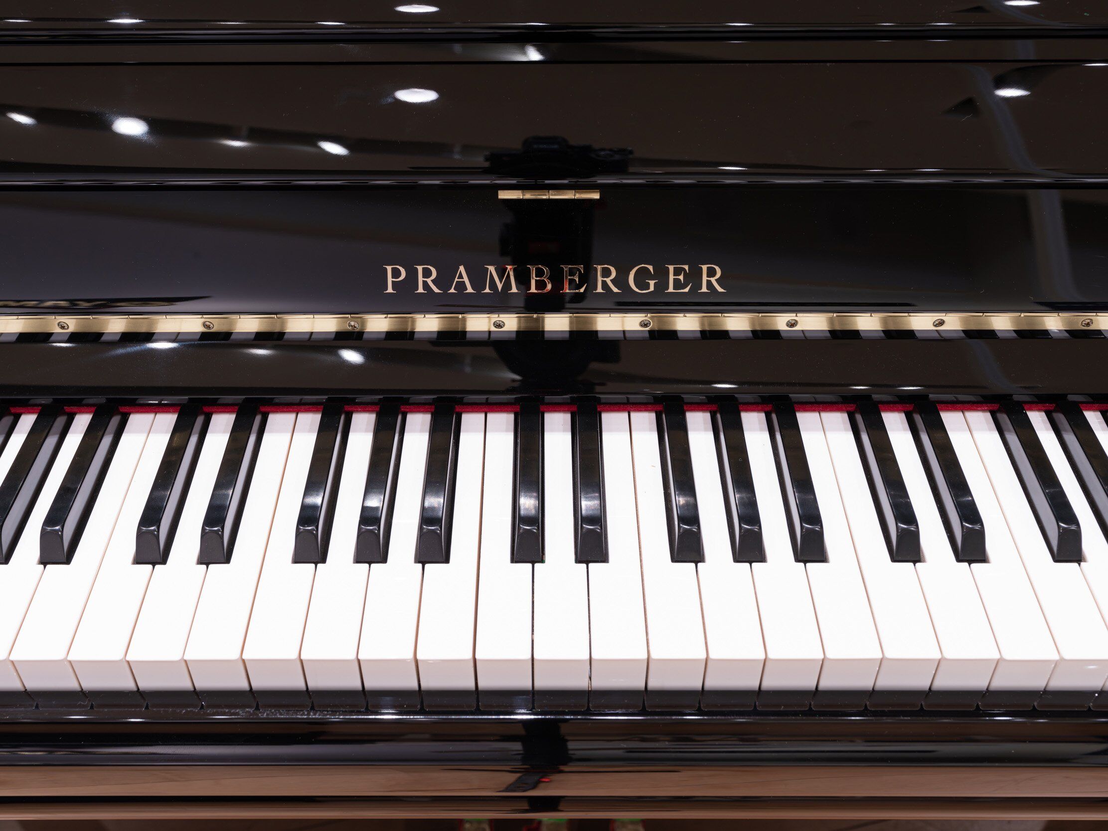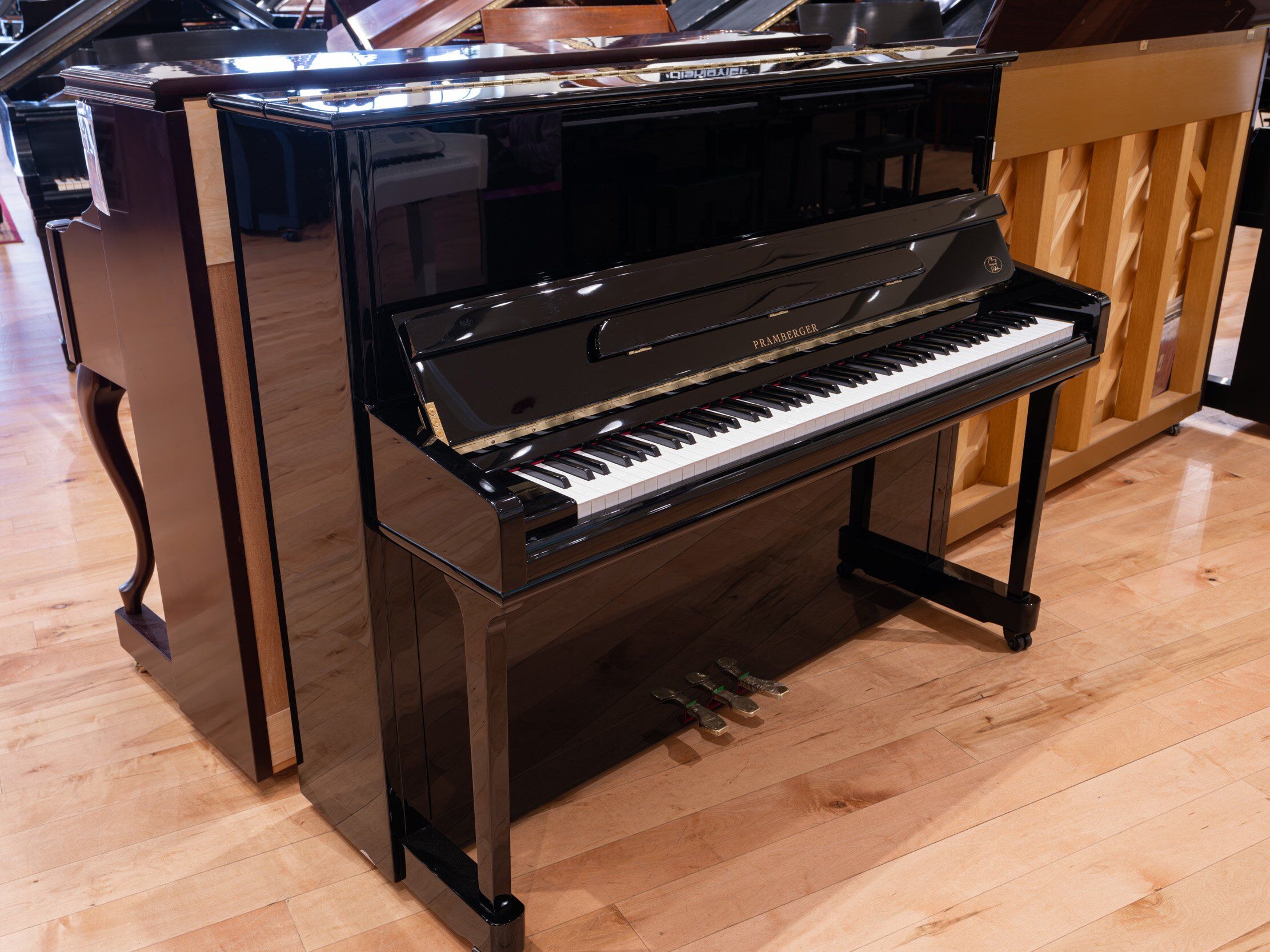 A beautiful upright Pramberger. It has a more weighted feel, and a delightfully warm sound. It would fit nicely in a small to medium sized room.