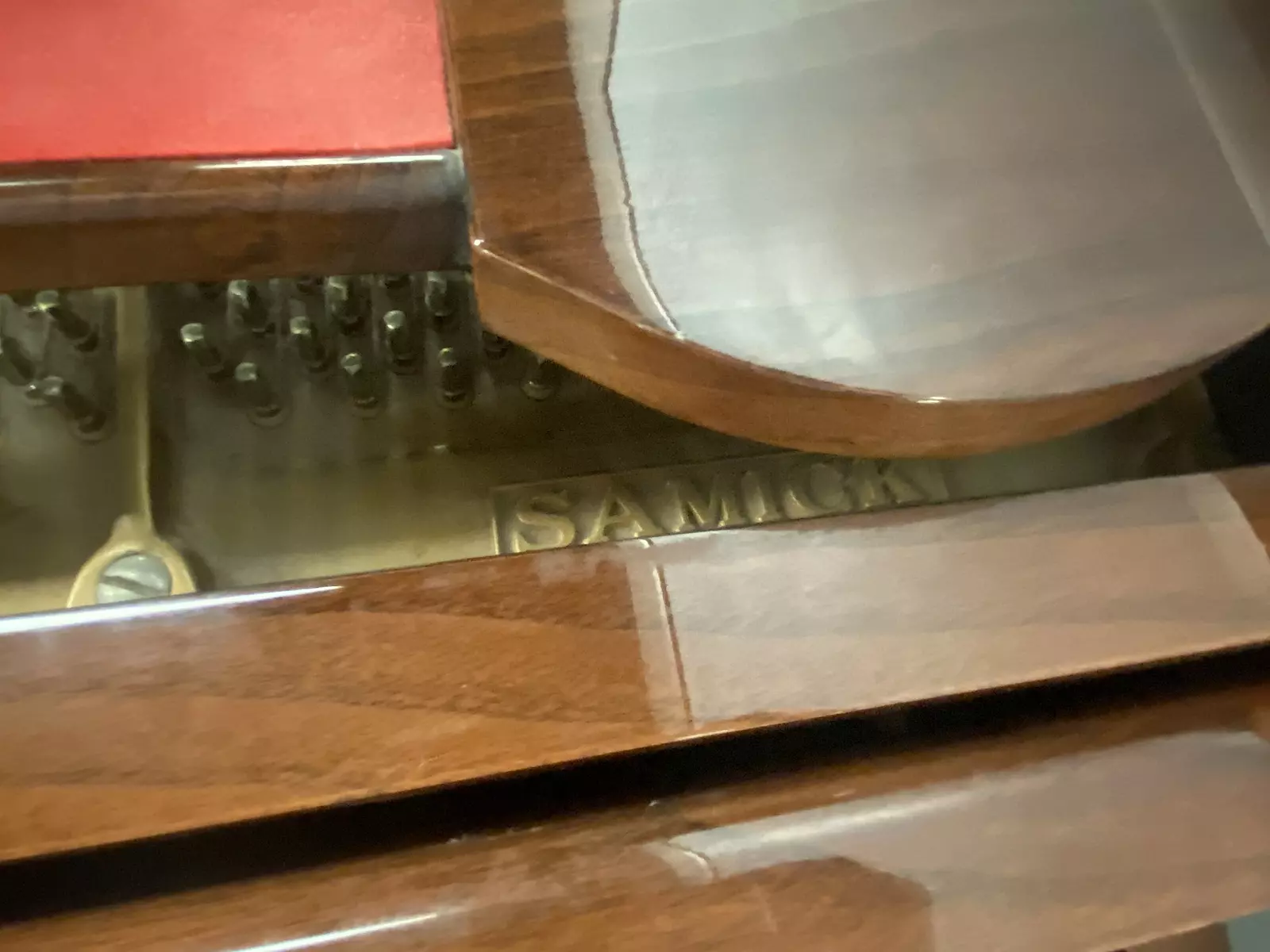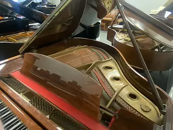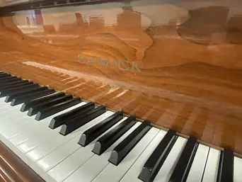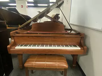 A wonderful baby grand on a budget! This piano is just a little bit bigger than 5 foot deep and has a nice sound. The cabinet style is a classic design with a sliding music rack, spade foot legs, and gold plate accenting the polished walnut finish. Stop in today to play this great looking Samick baby grand!