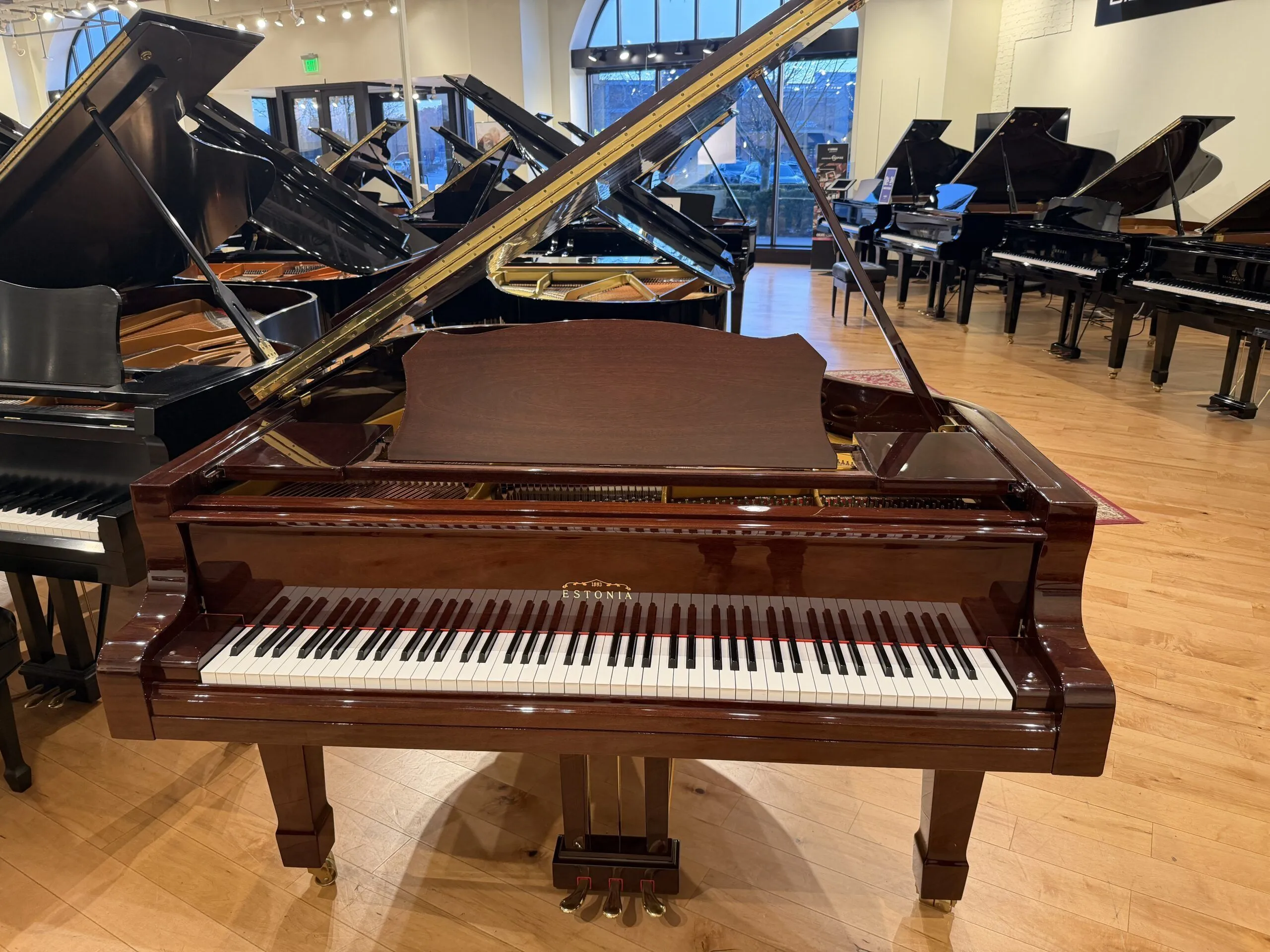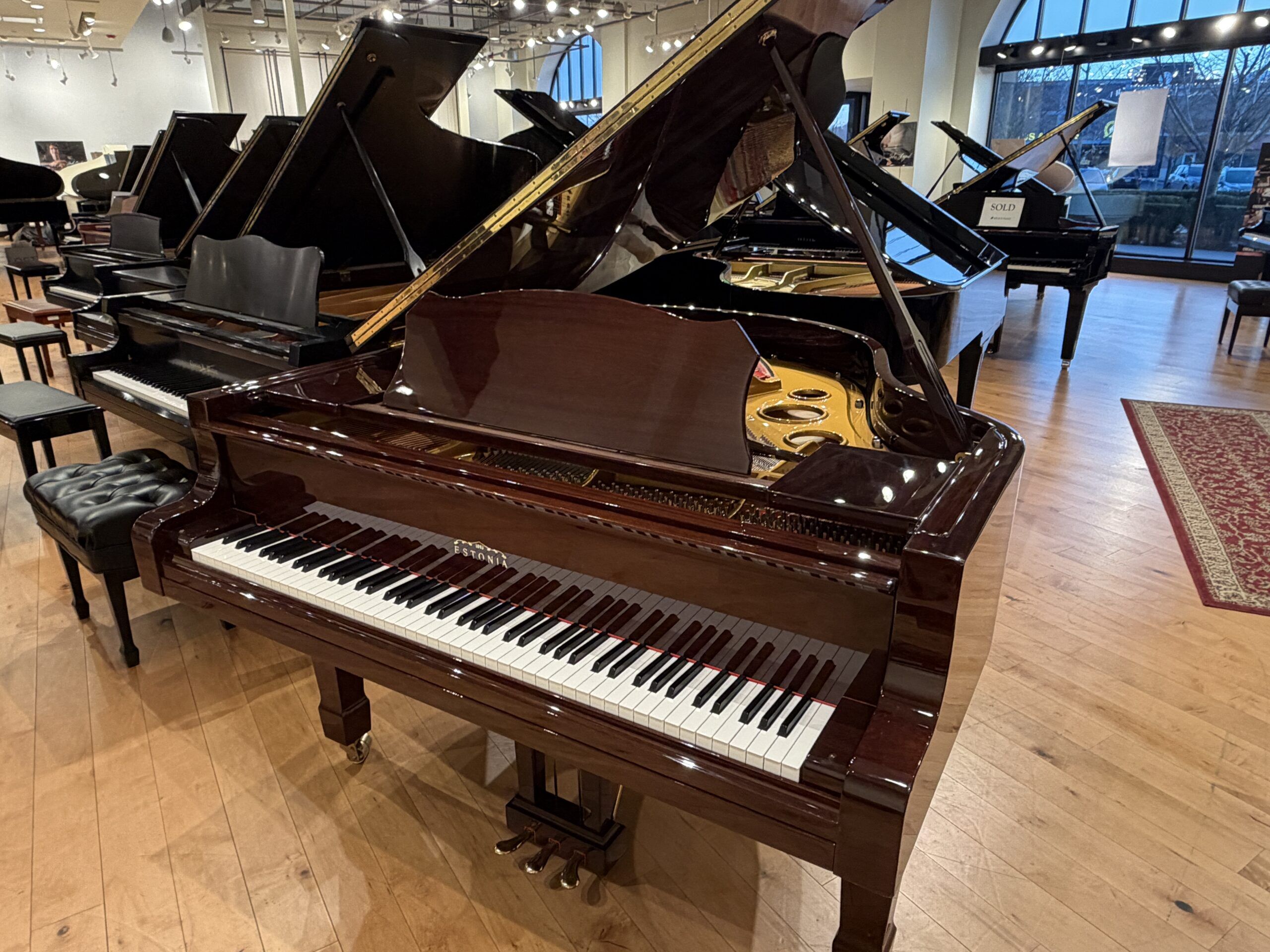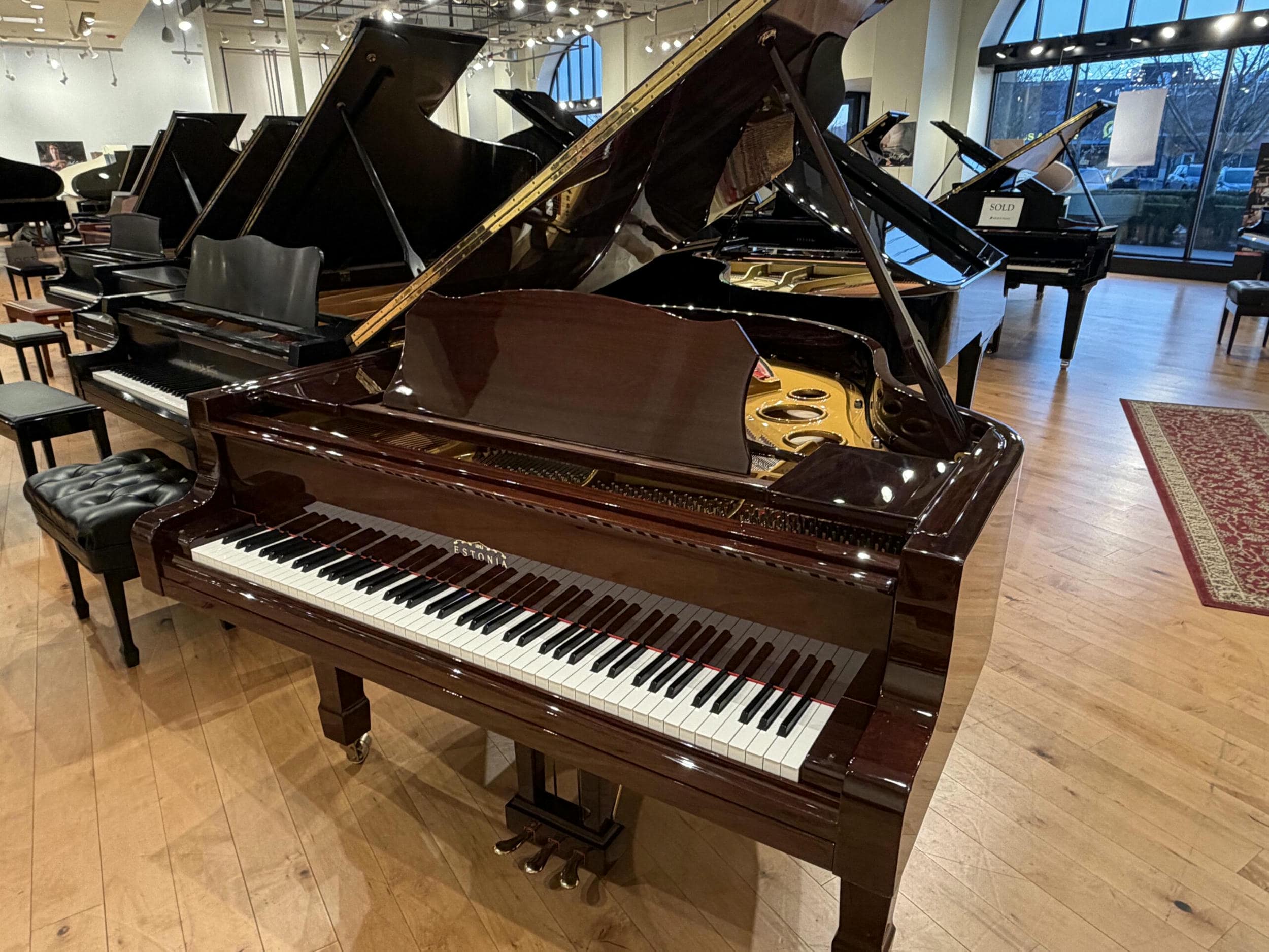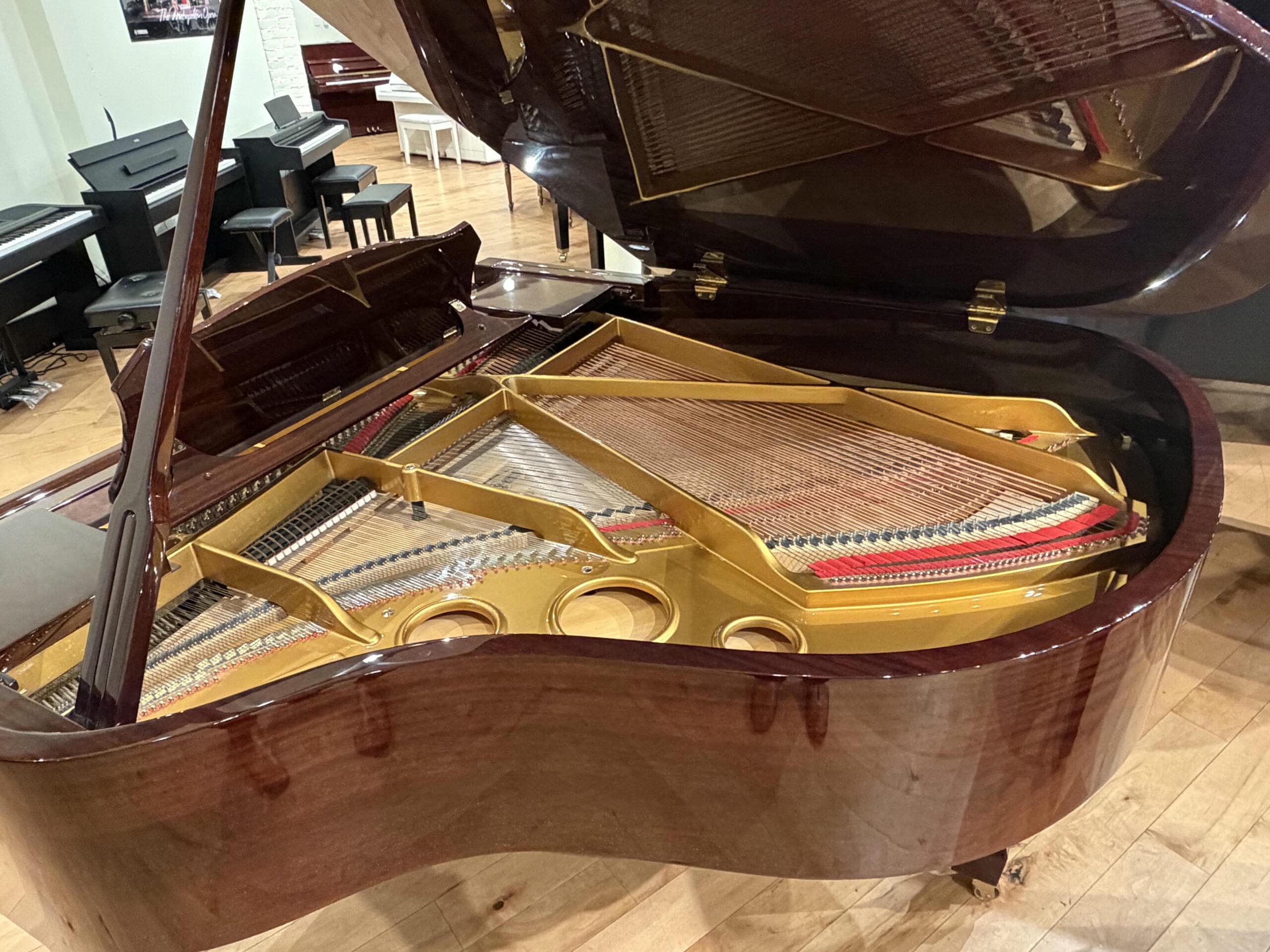 This beautiful, handmade piano represents a tremendous opportunity. Late-model pianos in this class are rare and tend to stay within a family for decades. The custom, tiger striped mahogany finish is in perfect condition with no fading. The sound is both warm and bold at the same time. The key action is sensitive and responsive making it perfect for both beginners wanting a quality instrument and for much more advanced pianists requiring a piano to grow with.