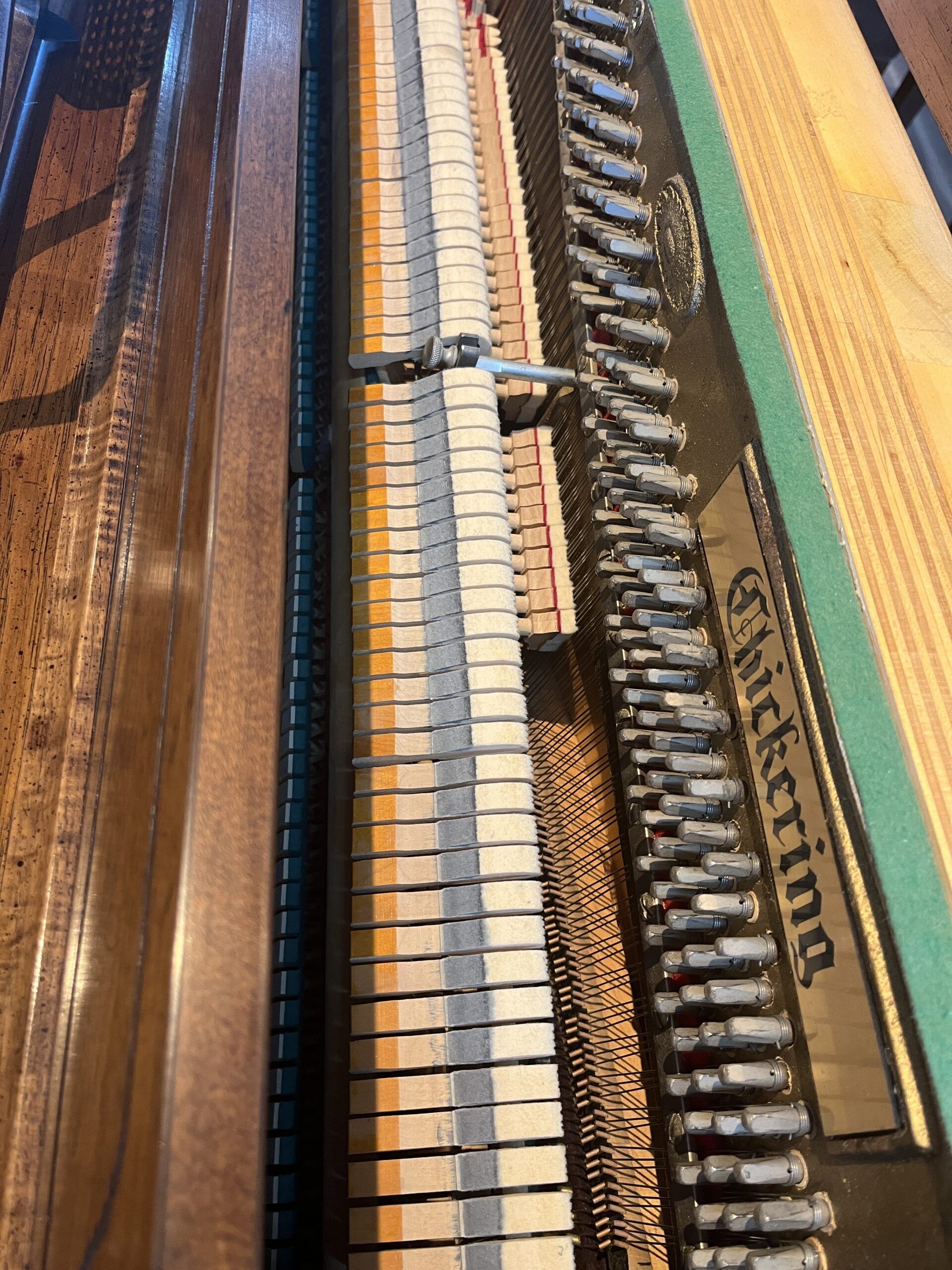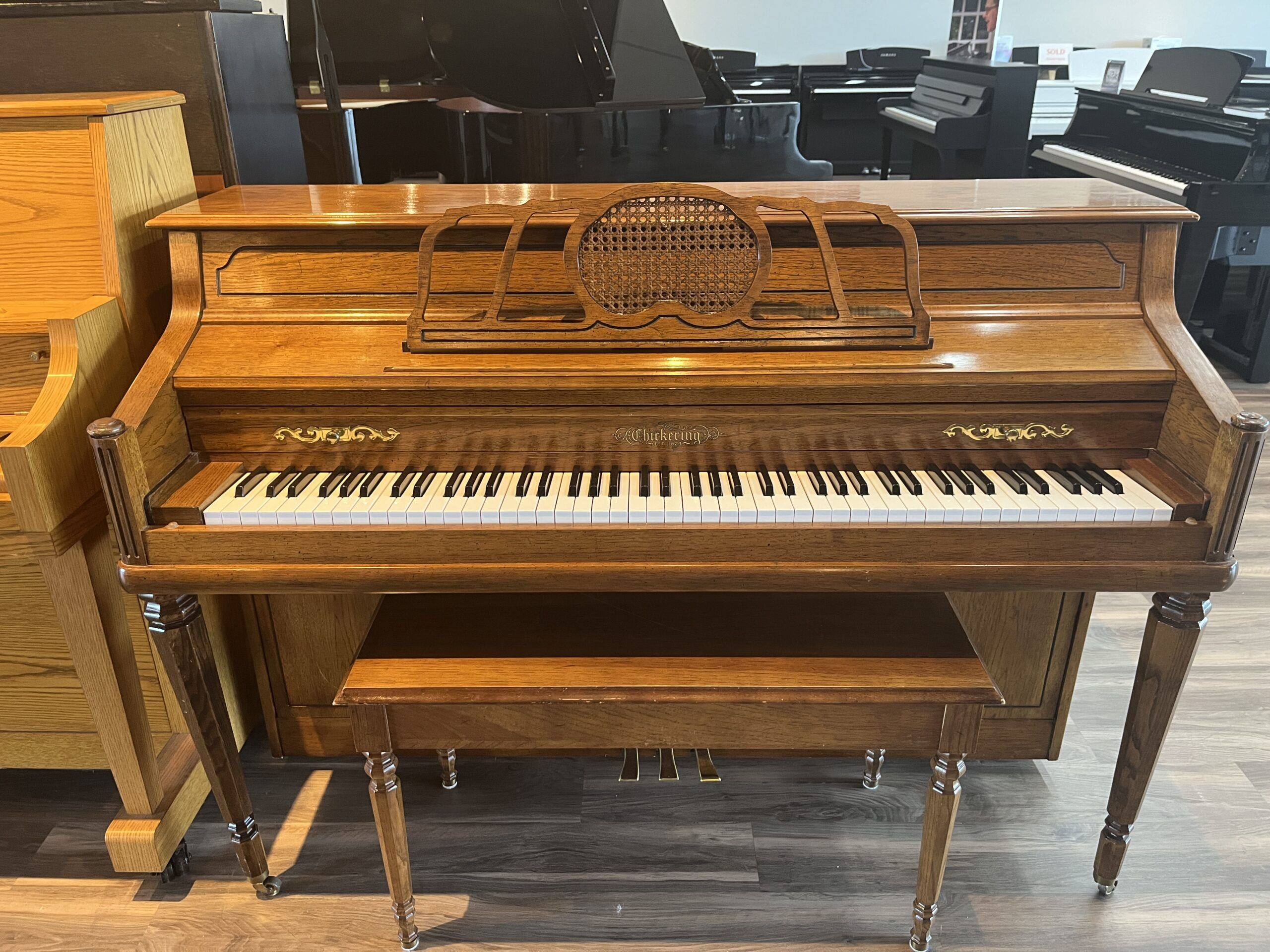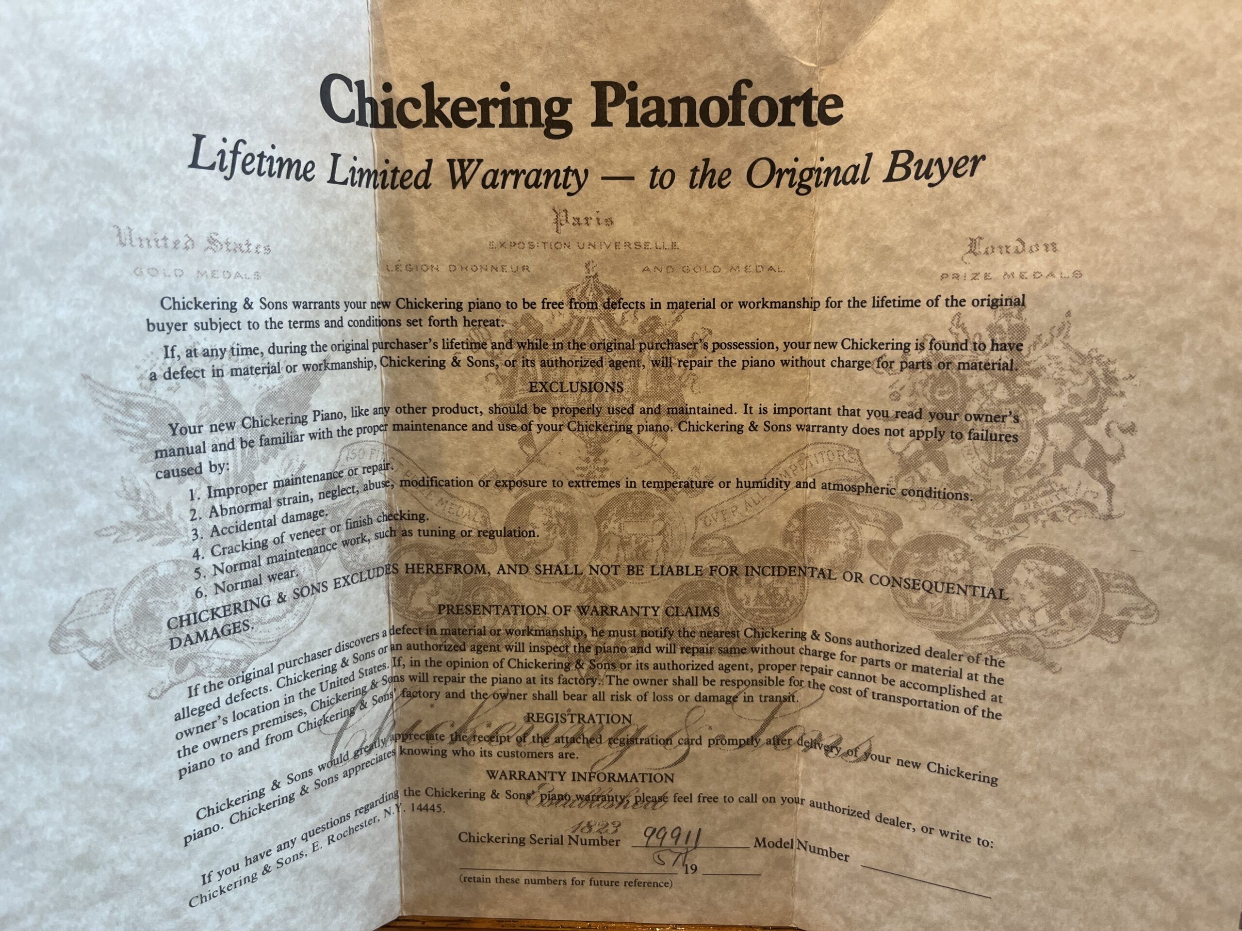 This sweet spinet has been lovingly cared for by one family. Chickering enjoyed a strong reputation among American piano builders. This is a good starter instrument for the aspiring pianist.