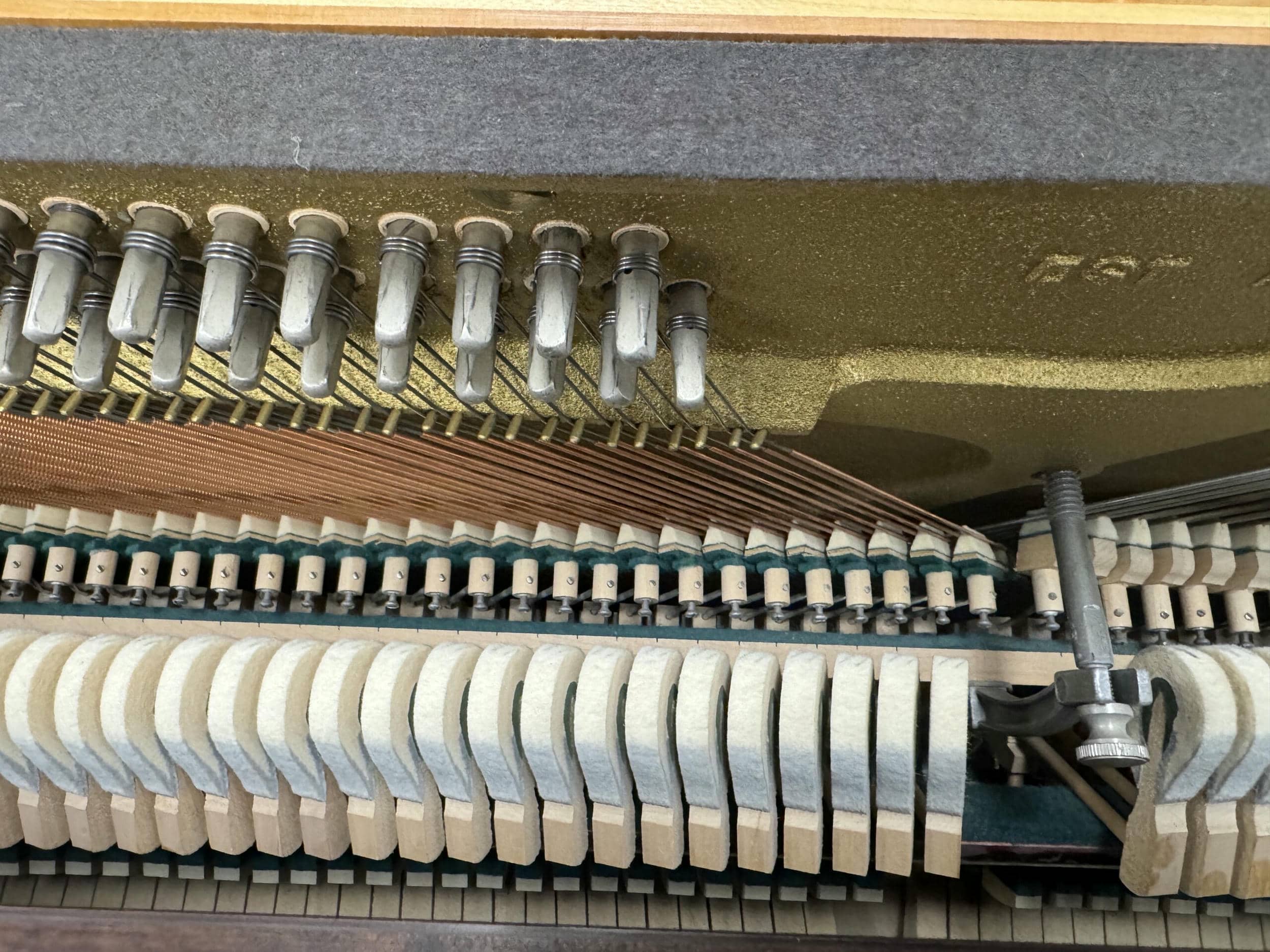 This small console has a warm, pleasant tone that makes it enjoyable to play. For the middle pedal, it has a bass-sostenuto pedal like a baby grand. This piano was built in South Haven, Michigan by Yamaha after they acquired the Everett Piano Company in 1973.