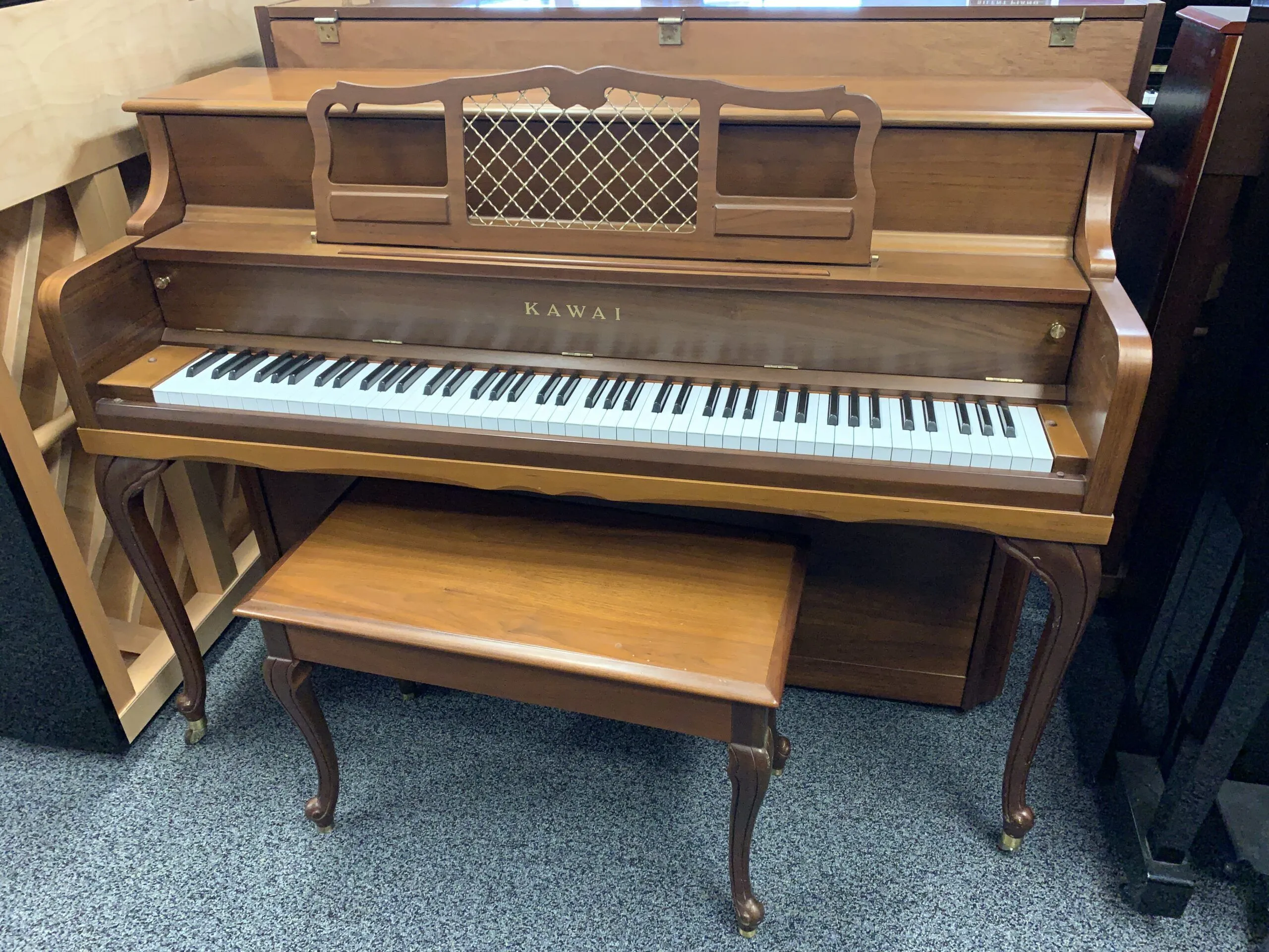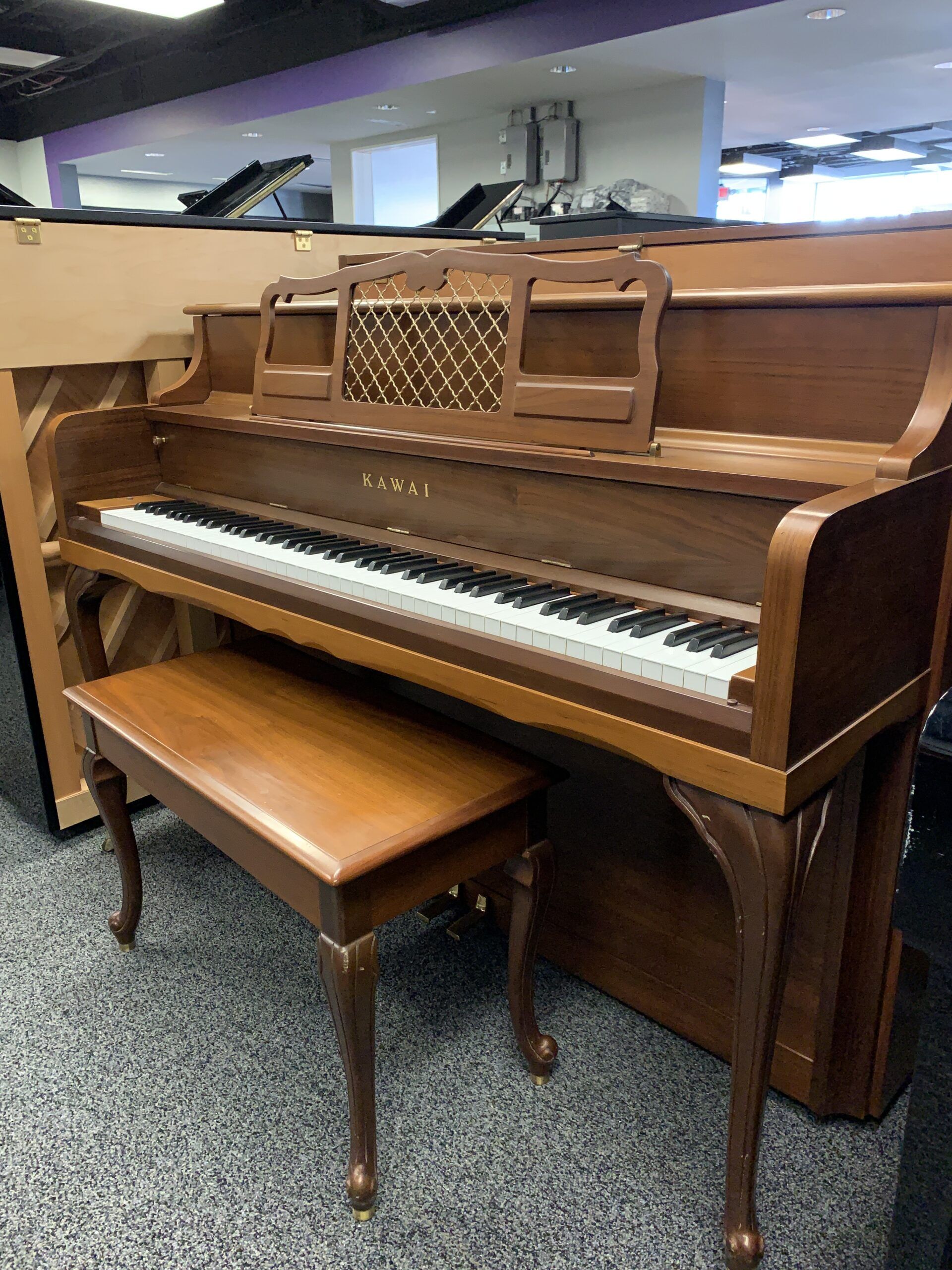 A classic upright for your home! This piano is in a Queen Anne style with curved front legs and a matching bench. The walnut finish is in superb condition.