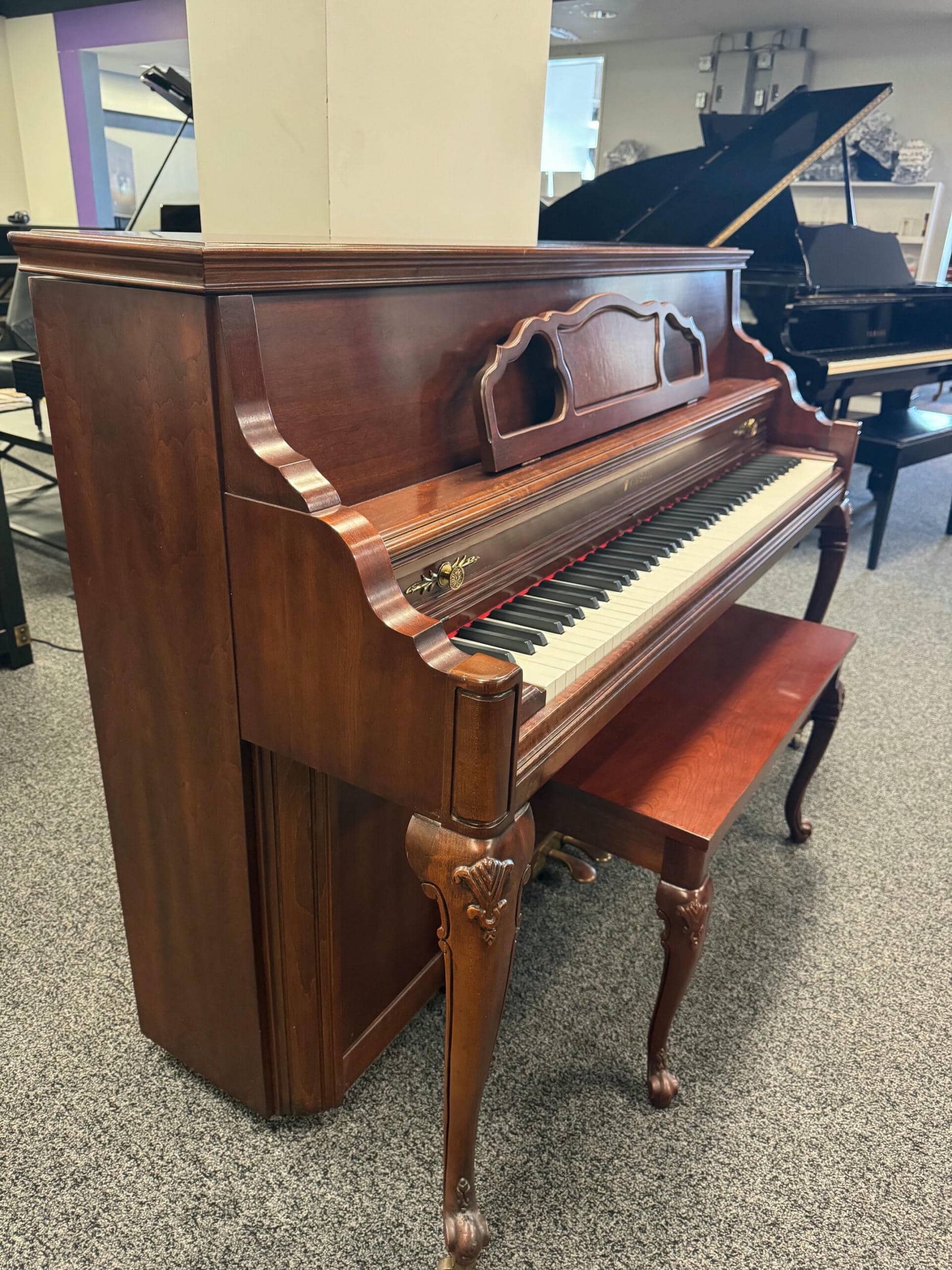 A lovely cherry console in a Queen Anne style. Tone is warm and pleasant, and the keys are responsive to the touch.