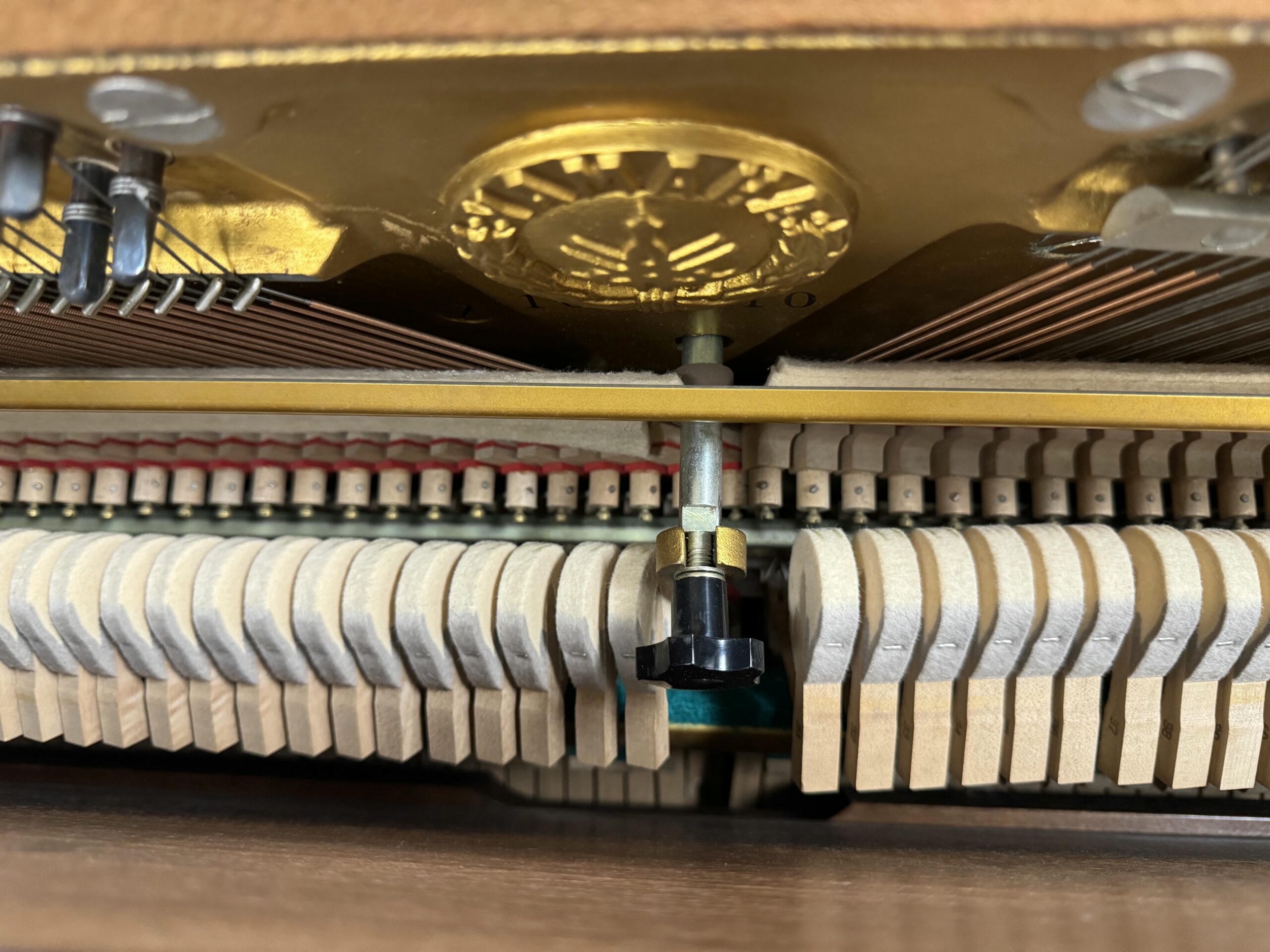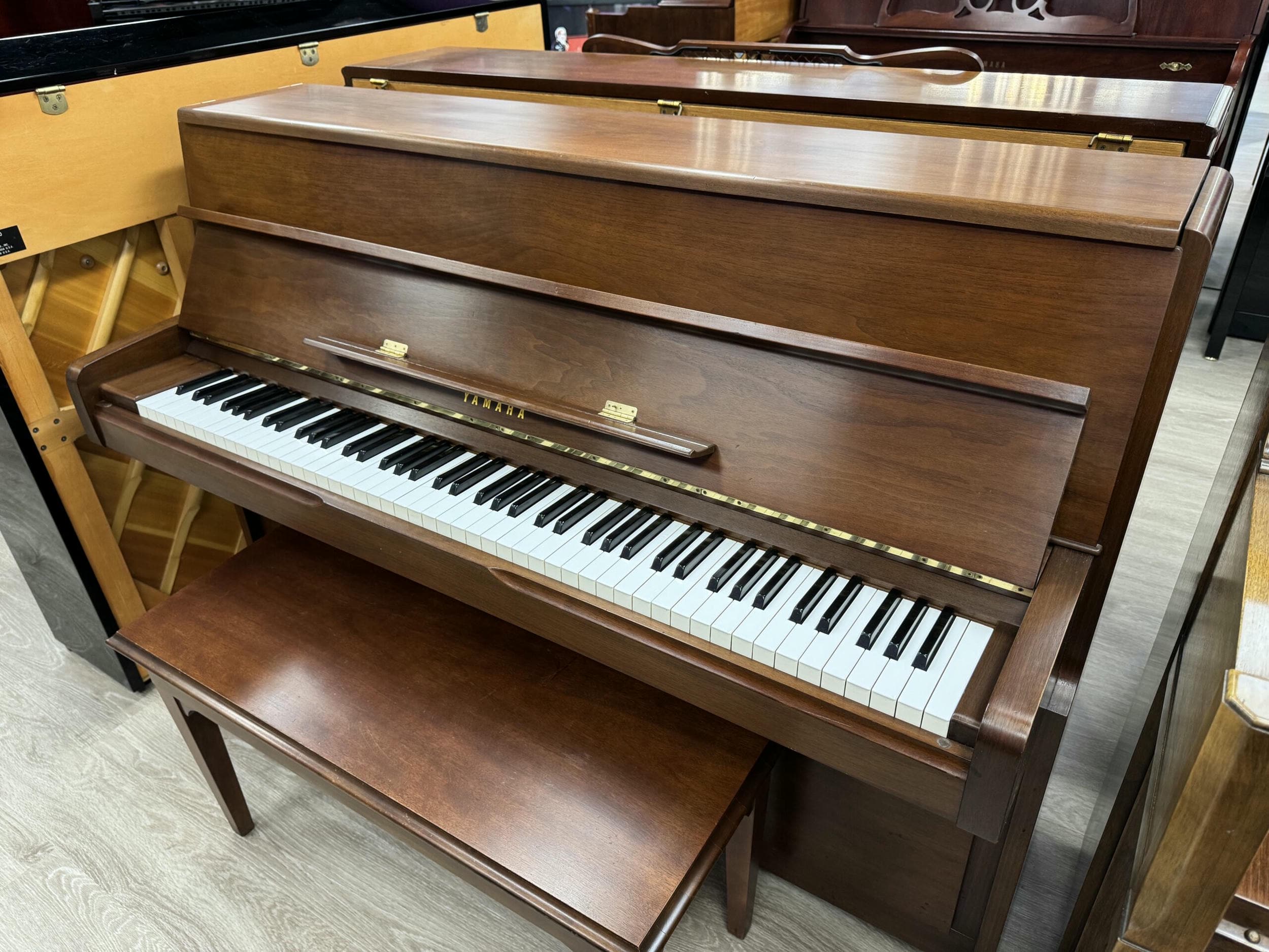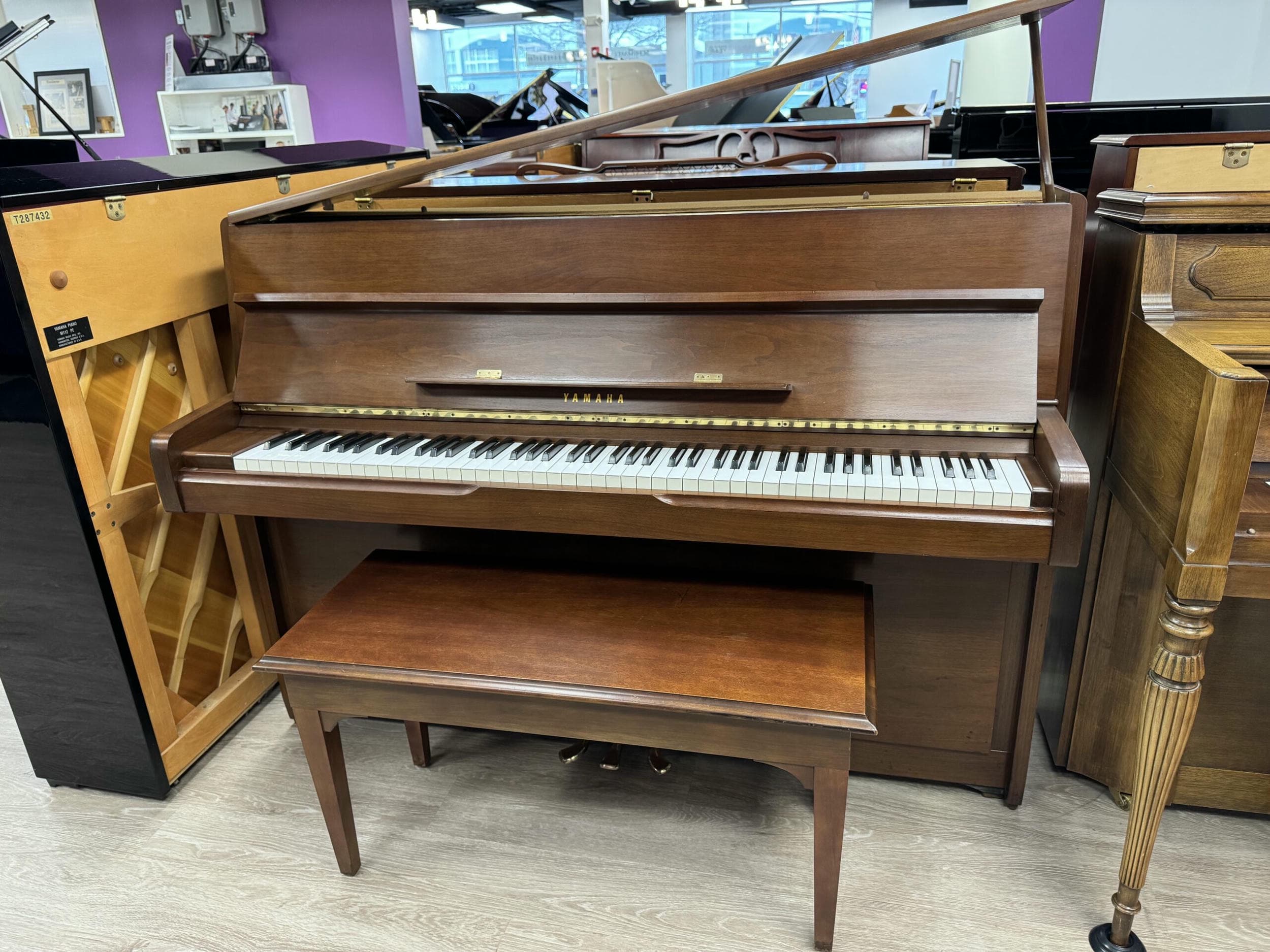 A beautiful, refinished Yamaha walnut console! This piano comes with a matching duet bench and the piano lid opens just like a baby grand piano. The M1A keys move with ease and are a light feel. The tone is consistent through the registers and has buoyant, friendly character great for recreational music making and families looking for their first-ever piano.