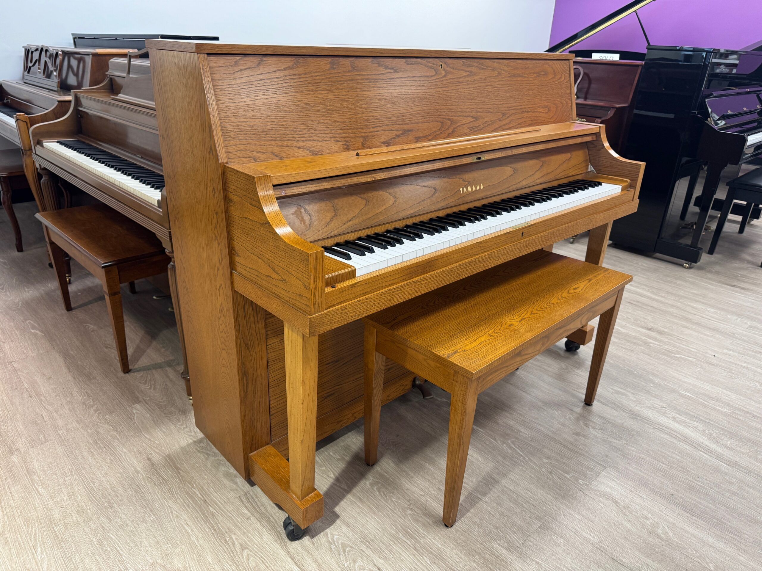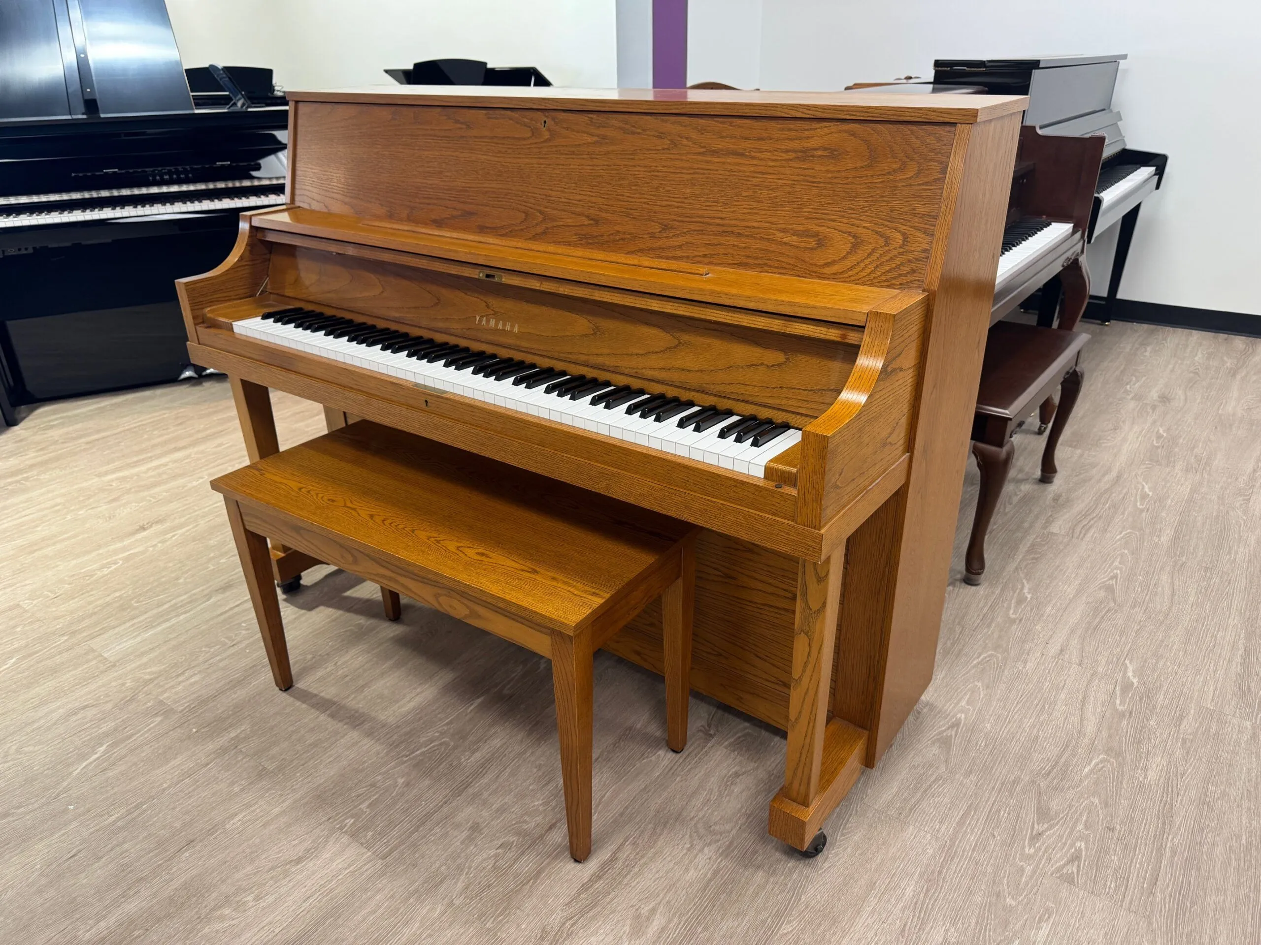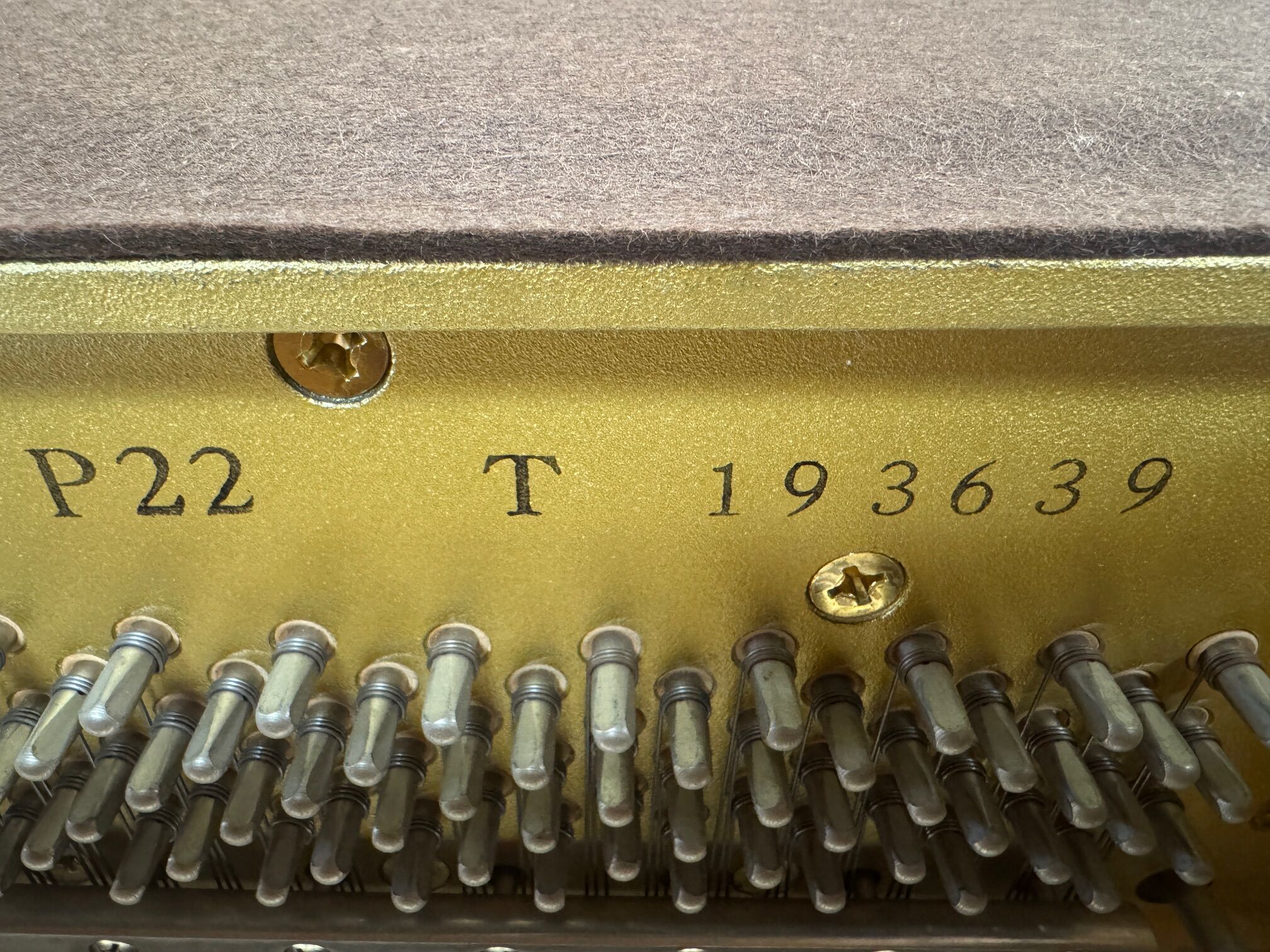 The Yamaha P22 is an institutional studio upright built to last. This American-made workhorse features a solid Sitka spruce soundboard and reinforced toe-block cabinetry, offering exceptional stability. Highly regarded by technicians for its “T” prefix serial number, it delivers a precise, professional touch and a clear tone that remains a gold standard in the used piano market.