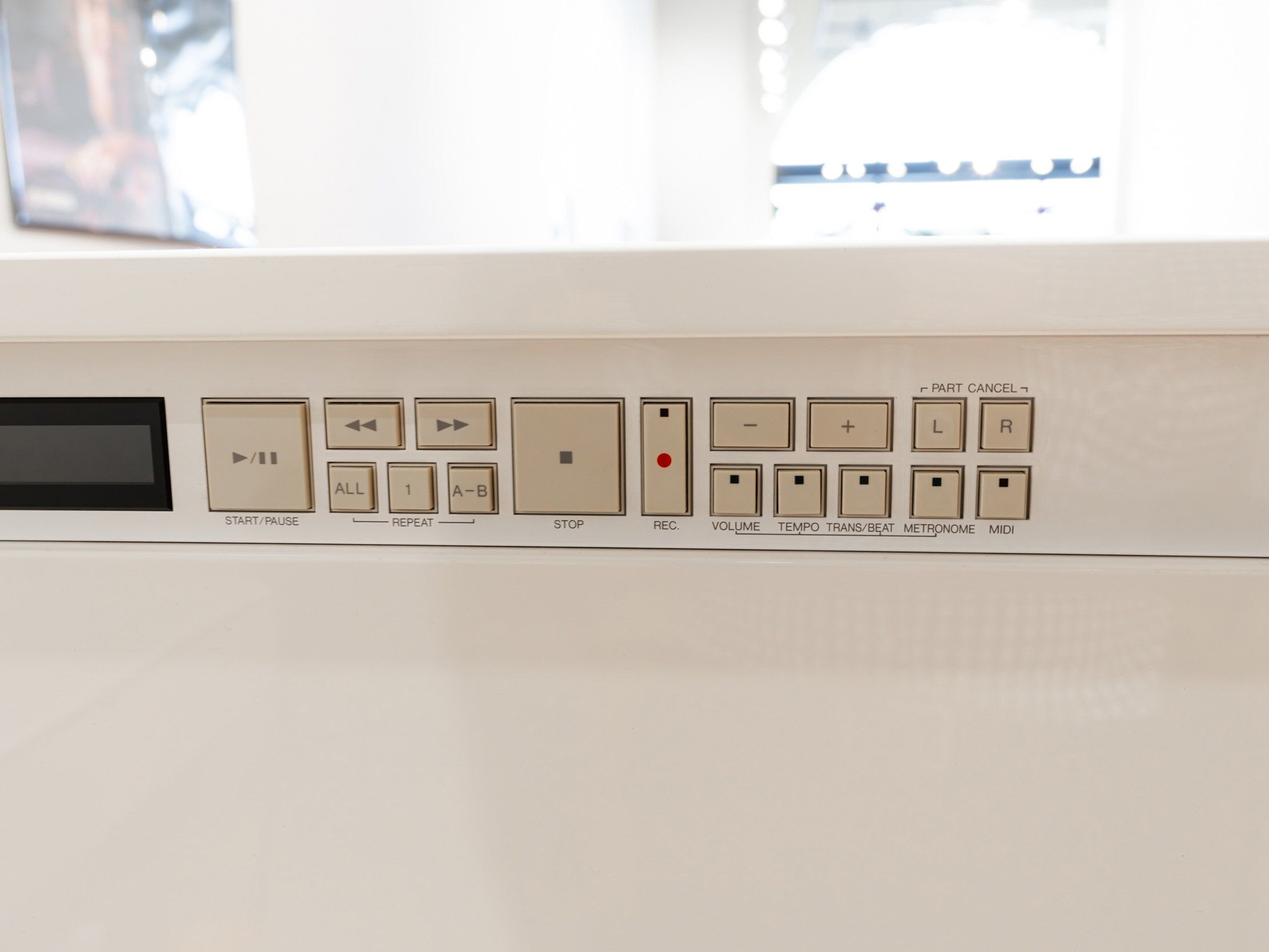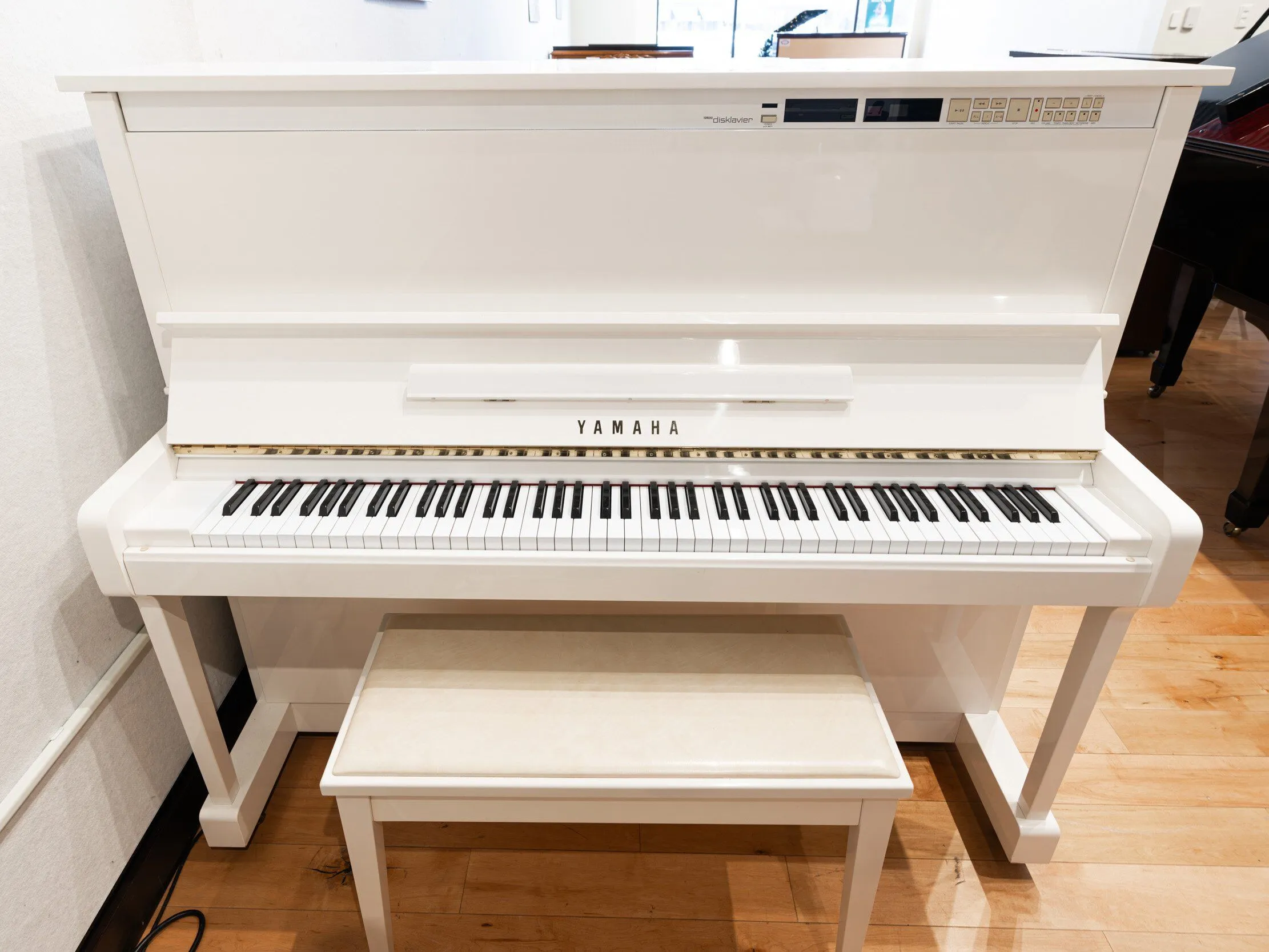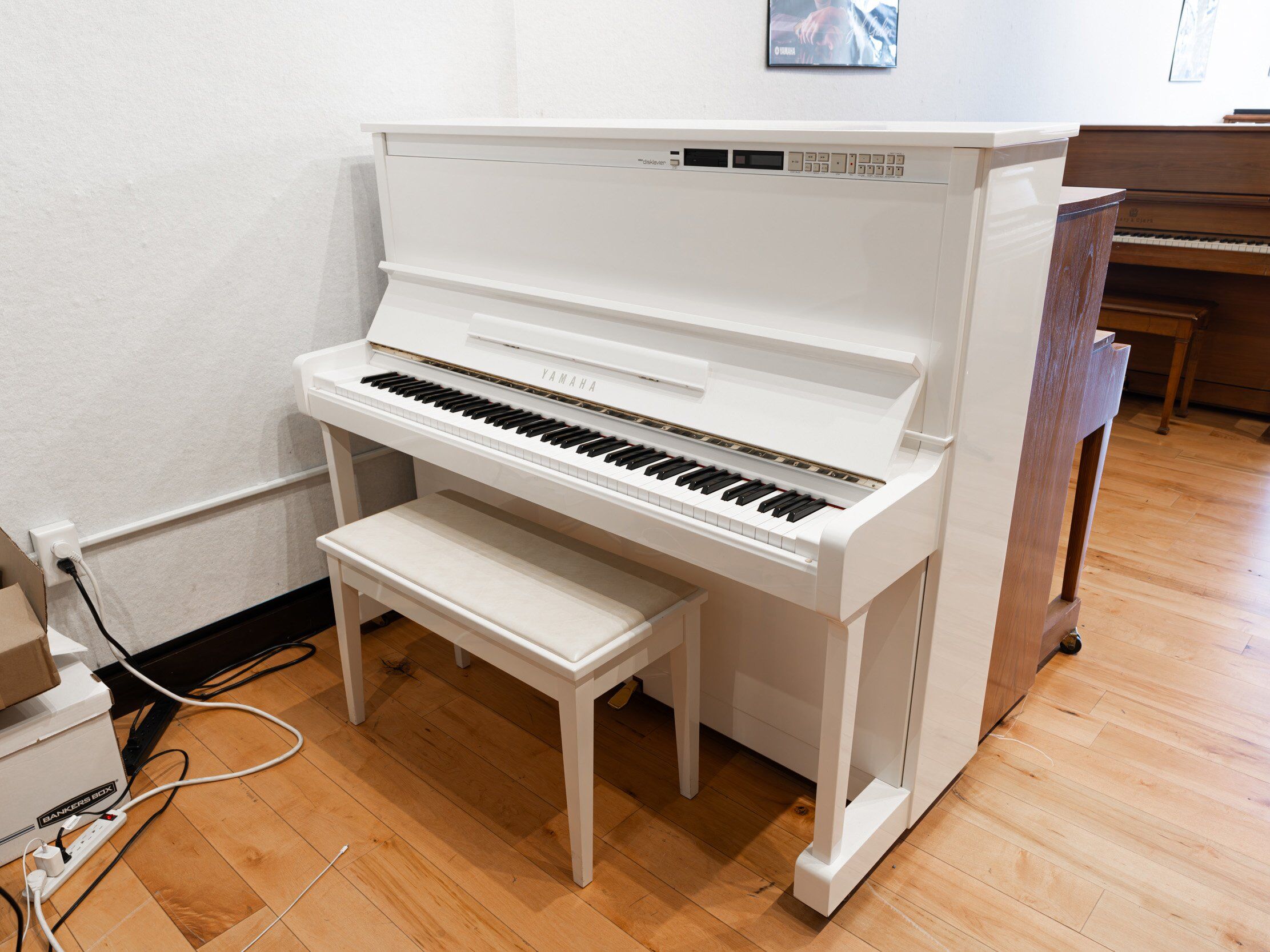 A handsome upright in polished white! This piano had one prior owner, and the finish is in excellent condition. Fun to play so come in and try it!
