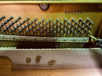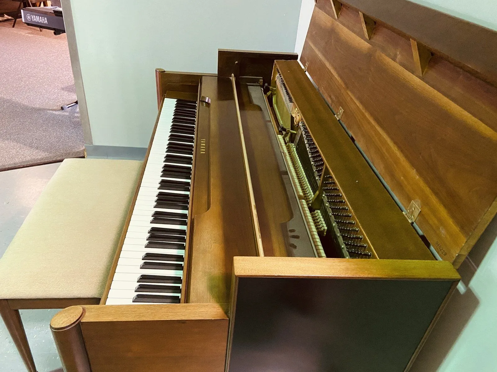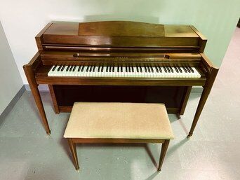 Own a piece of music history! This Yamaha spinet console is a gorgeous vintage instrument. No longer produced, this classic style of piano with drop action is perfect for your home with its walnut finish and compact size.