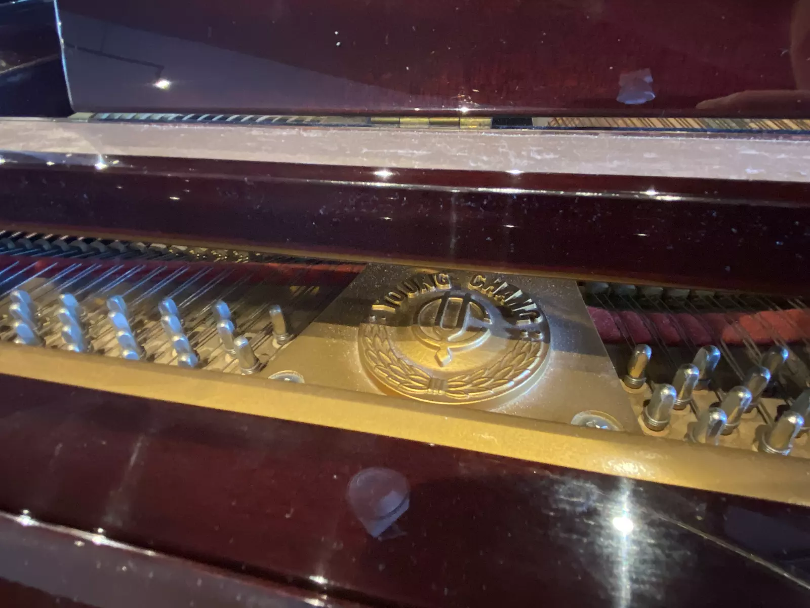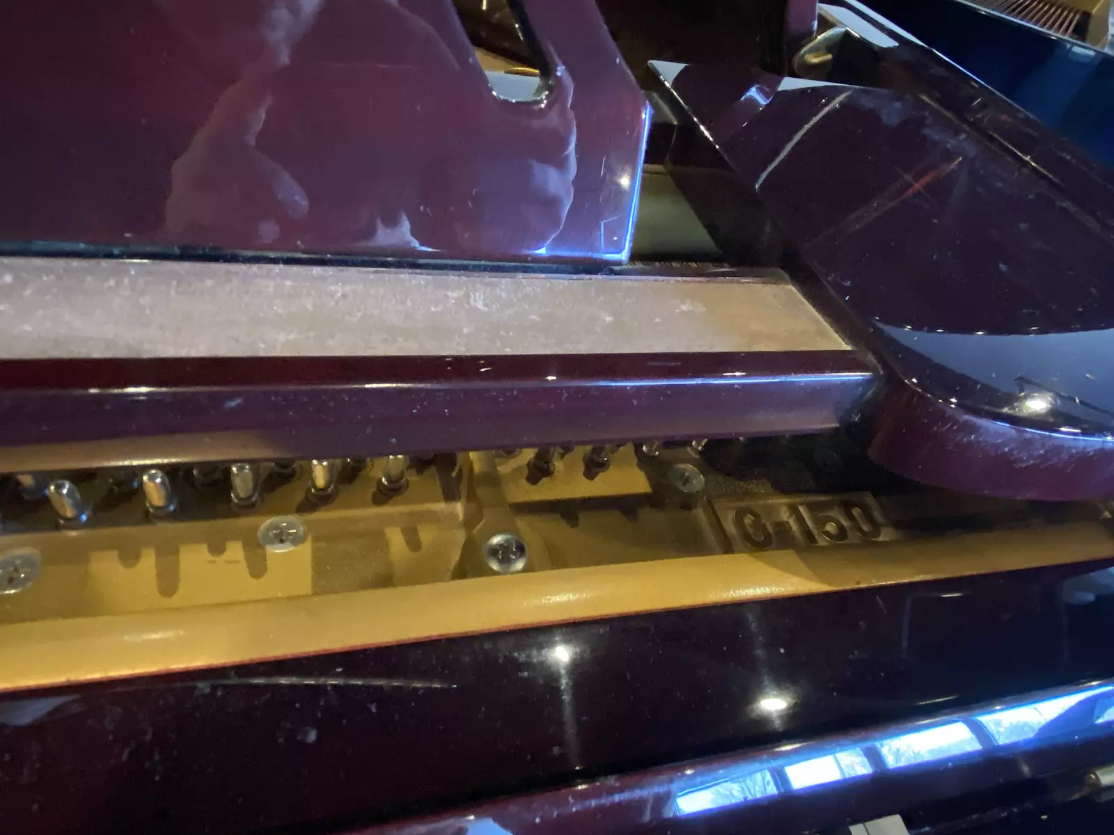 The polished mahogany cabinet of this Young Chang G150 is gorgeous and in excellent shape, and its petite stature makes it an excellent fit in nearly any space. At 5′, this baby grand packs a lot into a small package – excellent tone, firm but responsive action, and a lovely character to the sound.
