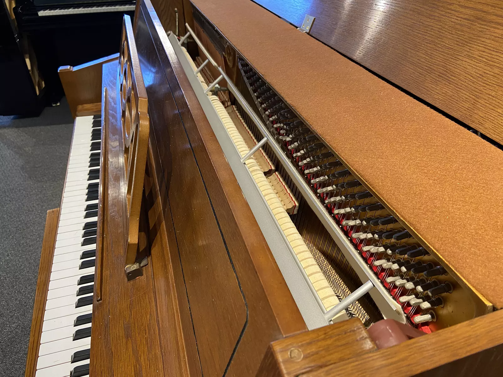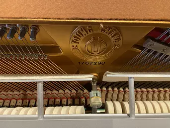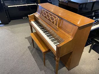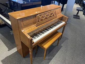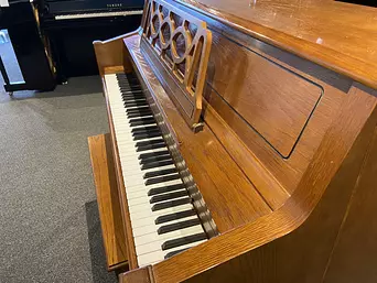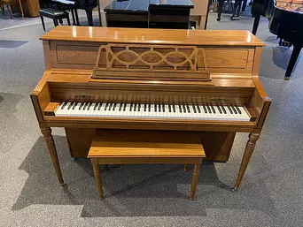 This Young Chang, crafted in Korea, boasts a beautiful light oak finish, responsive touch, and surprisingly rich tone for its size. Its classic round legs, ornamental music rack, and elegant cabinet make it a classy addition to any room. This piano will be a joy to play for musicians of any level.