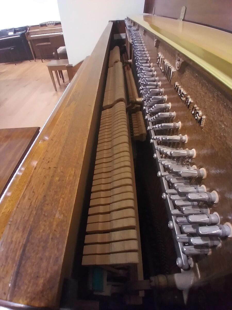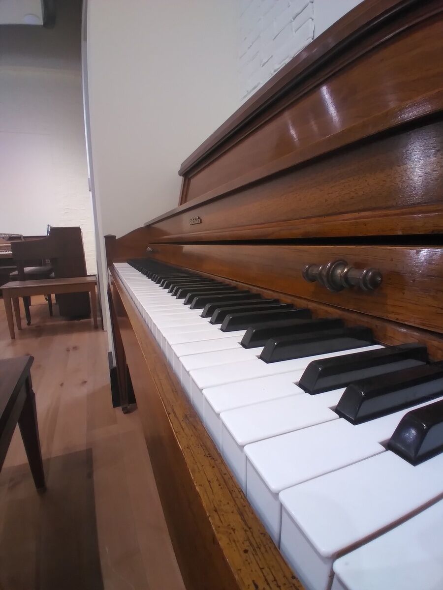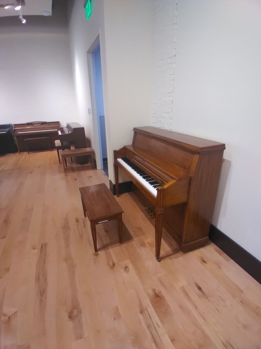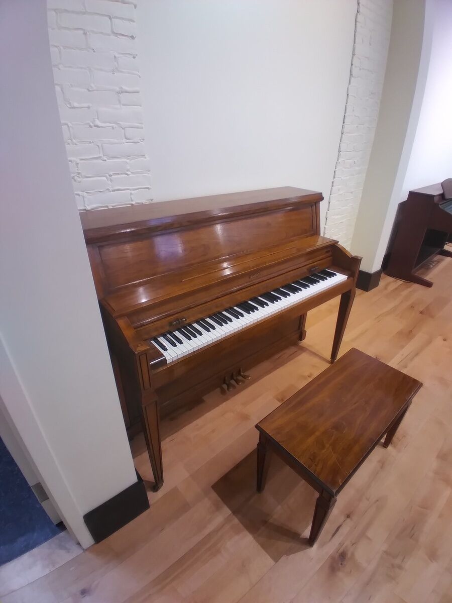 This sturdy piano has a great sound. There’s a little cosmetic wear but would be great for the home and with new students.