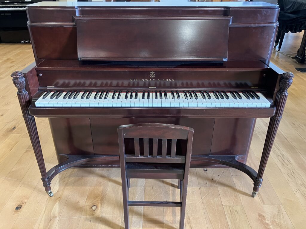 A rare, vintage find in great condition! This Model P from Steinway & Sons is a 45″ studio upright with a full sound. Note the attention to detail in the grand-style music wrack, fluted leg design, and curved toe blocks.
