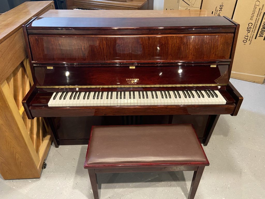 Hardman Peck has been making pianos in the US since the mid-19th century. This piano is from an era when they produced pianos in a joint venture with Kawai, giving you the input of Japanese craftsmanship, a beautiful well-maintained polished mahogany finish, and an approachable price point!